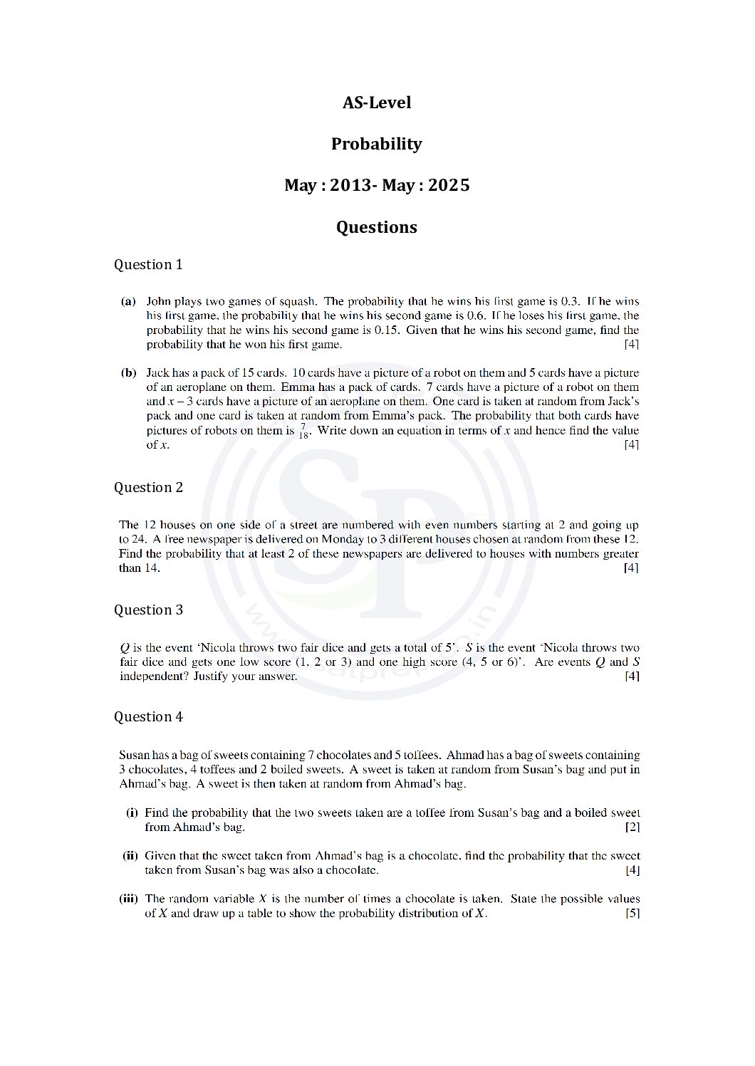 This post is about solution of probability questions of past papers. In this post questions are from different paper from May 2013 to May 2025. By this post students will come to know variety of questions asked in previous year papers. The questions type in this post is calculator . www.cie.org.uk p